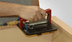 The Rhynomatic is a pneumatic hinge centering guide and pilot hole boaring tool that simplifies the installation of European style hinge mounting plates.